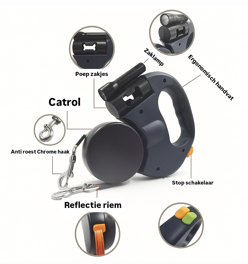 | Geïntegreerde led-zaklamp (afklikbaar) | Verlicht pad én hondenpoep-zone; altijd zicht, veilig in het donker. |
