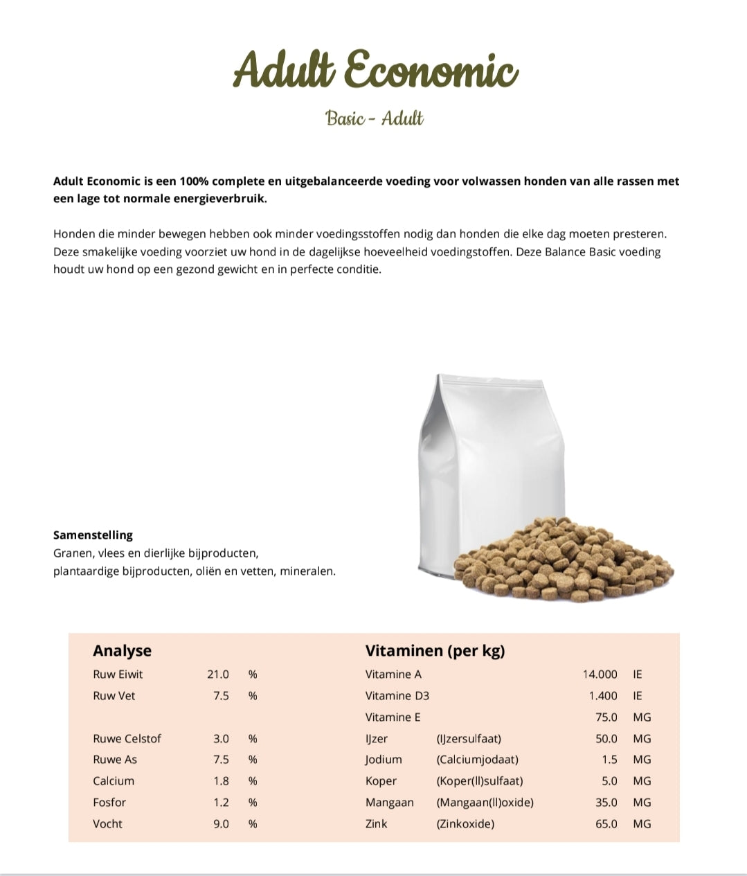 Samenstelling: Granen, vlees en dierlijke bijproducten, plantaardige bijproducten, oliën en vetten, mineralen.